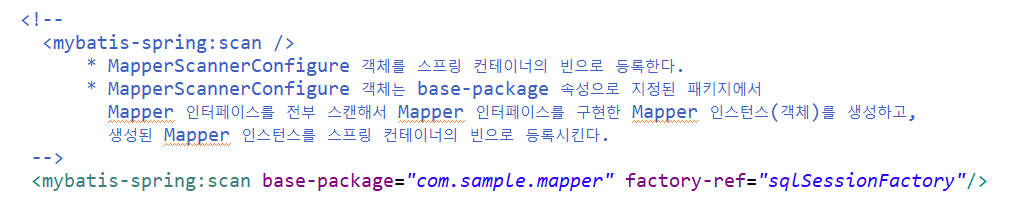 <mybatis-spring:scan base-package="com.sample.mapper" factory-ref="sqlSessionFactory"/>