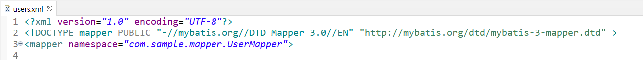 * UserMapper 인터페이스와 짝이 되는 Mapper파일 (users.xml) 작성