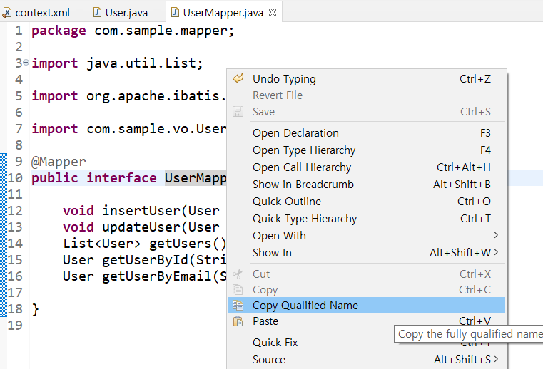 * UserMapper에 대고 copy qualified name 한 뒤, 매퍼파일 (users.xml)의 namespace에 붙여넣기
