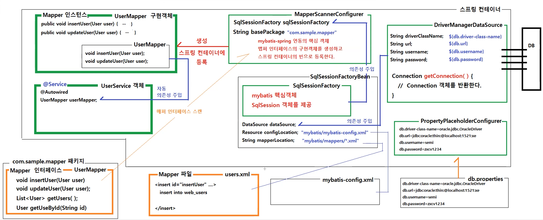 * SqlSessionFactoryBean은 mybatis 환경설정파일, 매퍼파일, Connection Pool을 주입받아서 이 정보를 가지고