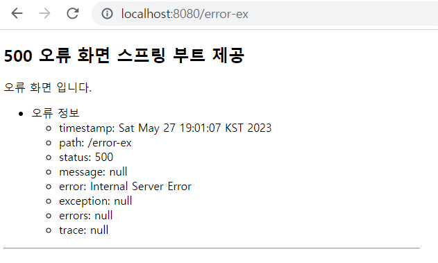 <h2>500 오류 화면 스프링 부트 제공</h2>
