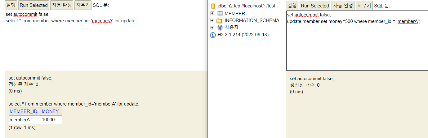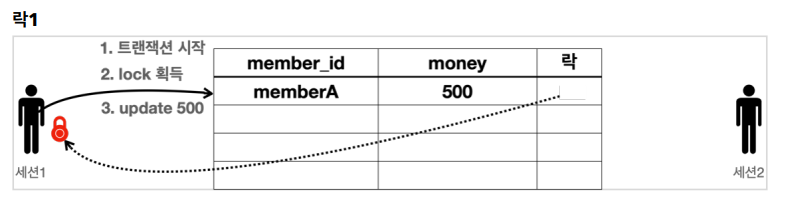 세션 1이 트랜잭션 시작 -> memberA 로우의 락 획득 -> 데이터 업데이트 -> 커밋 아직 안함