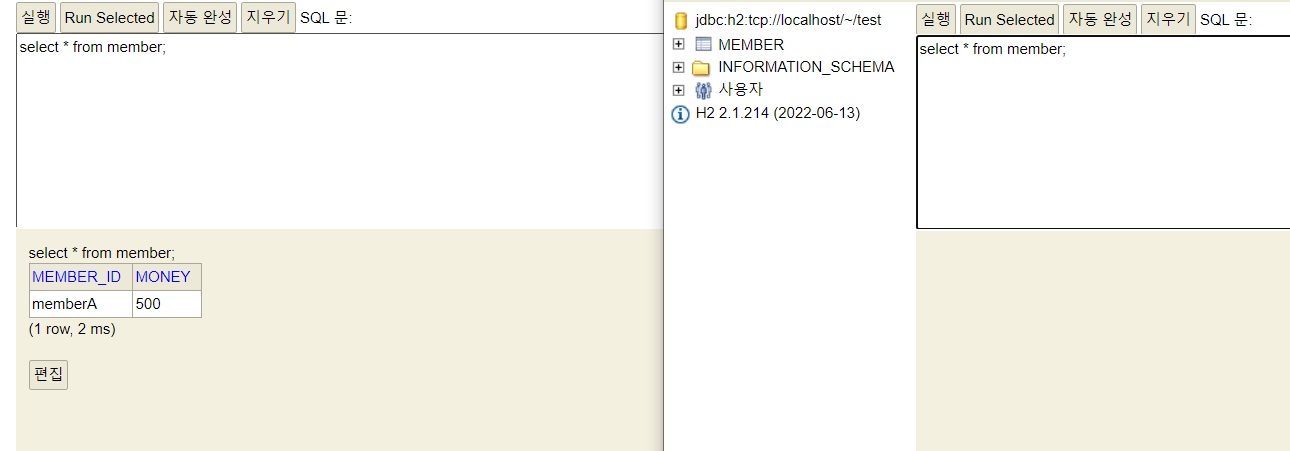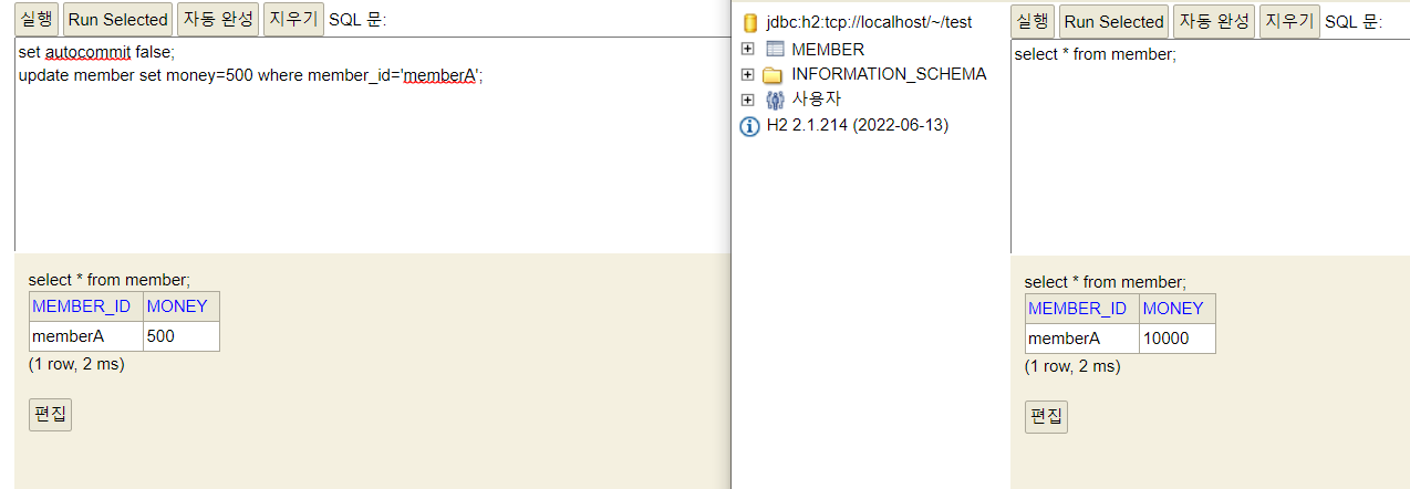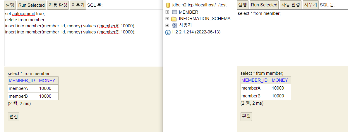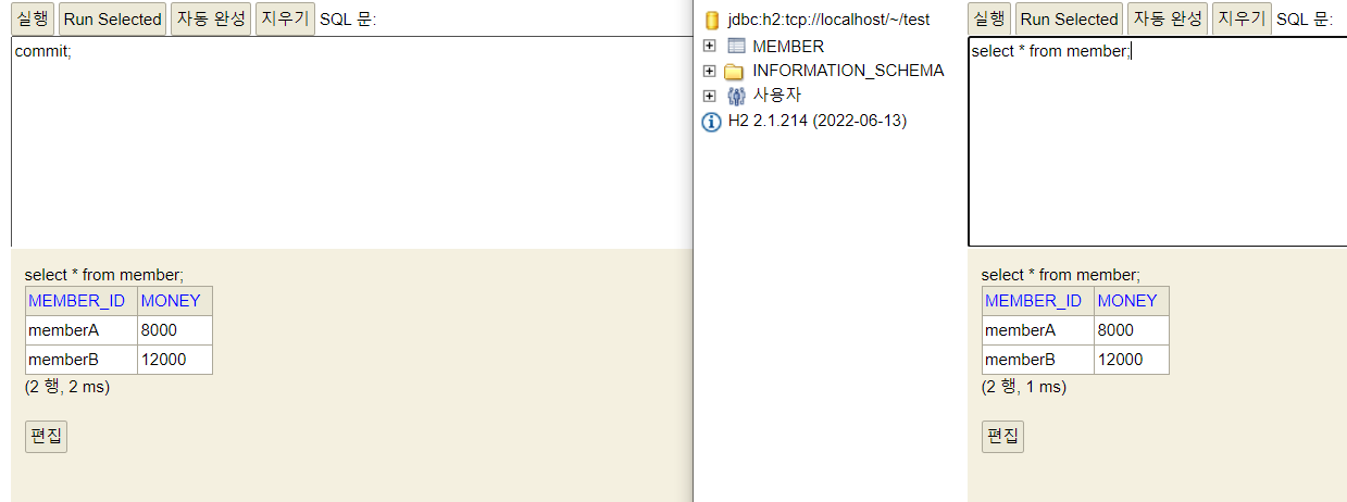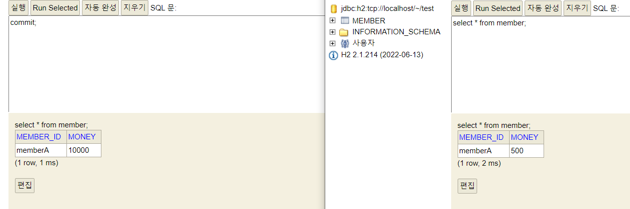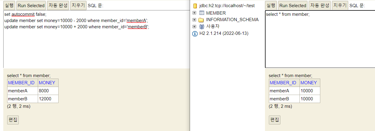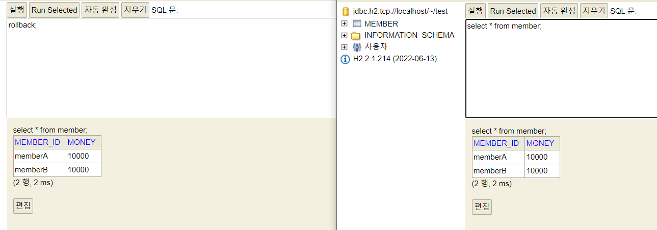 - 계좌이체 실패 -> 롤백 -> memberA의 돈이 기존 10000원으로 복구