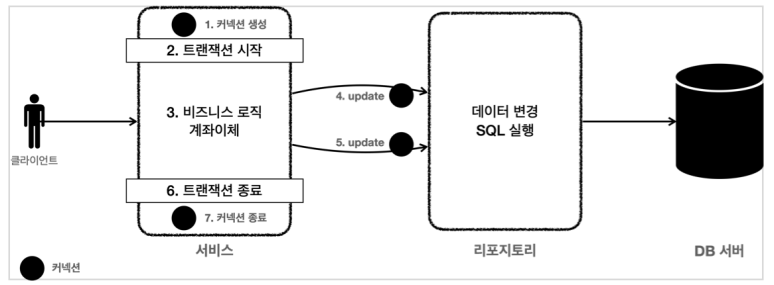 ( 비즈니스 로직이 잘못되면 해당 로직으로 인해 문제되는 부분을 함께 롤백해야 하기 때문 ) - 트랜잭션을 시작하려면 커넥션 필요