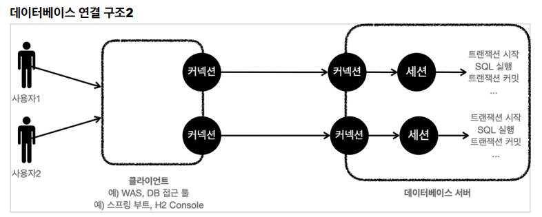 이때 데이터베이스 서버는 내부에 세션을 만듦. 커넥션을 통한 모든 요청은 세션을 통해 실행 - 개발자 -> 클라이언트를 통해 SQL 전달 -> 커넥션에 연결된 세션이 SQL 실행