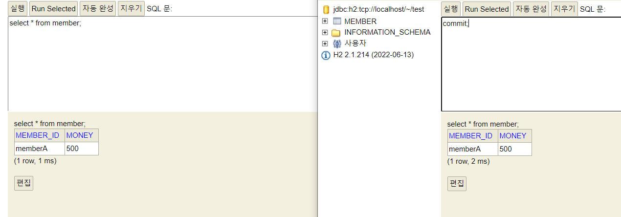 계좌이체 실행 -> 수동 커밋 설정 -> 아직 커밋 안함