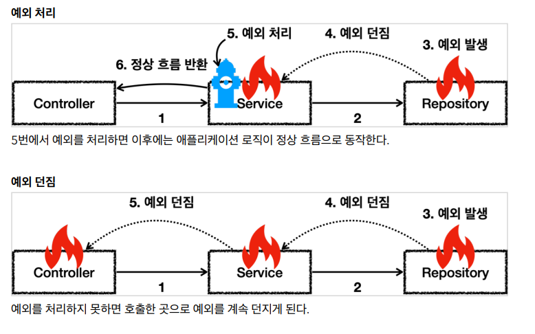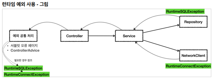 - 런타임 예외 -> 서비스, 컨트롤러는 해당 예외를 처리할 수 없으면 별도의 선언 없이 그냥 두면 됨