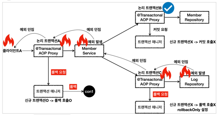 - 논리 트랜잭션 중 하나라도 롤백되면 전체 트랜잭션 롤백 (rollbackOnly = true 자동 표시)