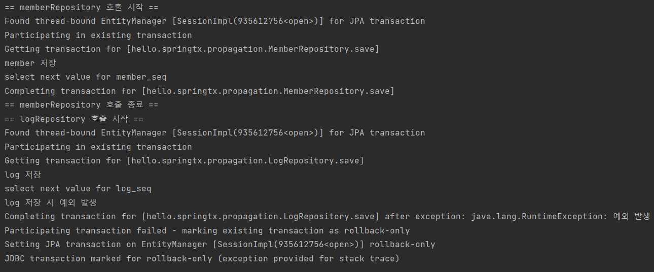 -> 신규 트랜잭션 X -> 실제 롤백 호출 X -> rollbackOnly 설정(표시) - LogRepository가 던진 예외를 트랜잭션 AOP도 그대로 던짐