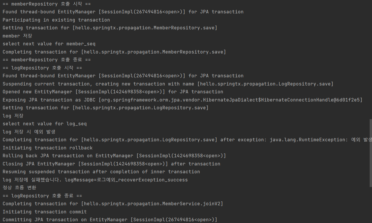 - LogRepository에서 런타임 예외 발생 -> LogRepository의 트랜잭션 AOP가 예외 받음 -> 런타임 예외니까 트랜잭션 매니저한테 롤백 요청