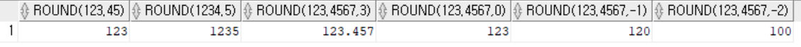 round(123.4567, 0),                -- 1의 자리로 반올림