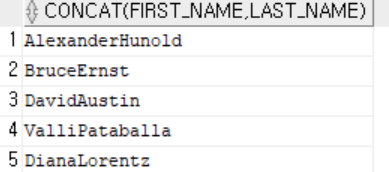 -- concat(컬럼 혹은 표현식, 컬럼 혹은 표현식) : 두 값을 합쳐서 새로운 텍스트를 반환