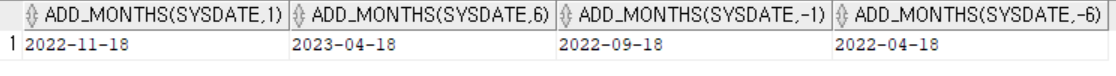 - add_months(날짜, 숫자) : 날짜에서 숫자만큼 개월수를 증감시킨 값을 반환한다.