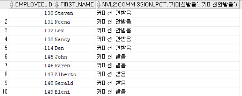 select employee_id, first_name, salary, nvl(to_char(commission_pct, '0.99'),'없음')
