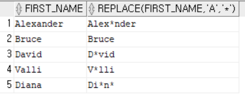 - replace(column or exp, 'search_string', 'replacement_string') : 텍스트에서 검색된 문자를 대체할 문자로 바꾼다.