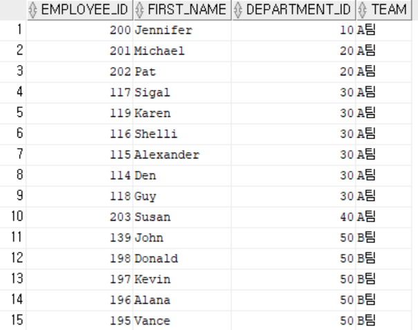 -- A팀(10, 20, 30, 40번 부서), B팀(50, 60번 부서), C팀(70, 80번 부서), D팀(그 외 부서)으로 직원들의 팀 나누기