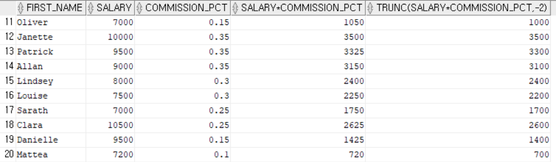 select first_name, salary, commission_pct, salary*commission_pct, trunc(salary*commission_pct, -2)