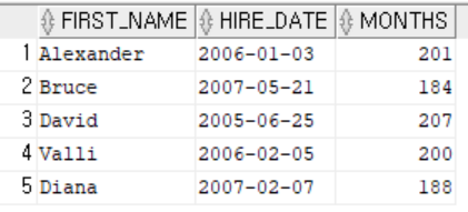 select first_name, hire_date, trunc(months_between(sysdate, hire_date)) MONTHS