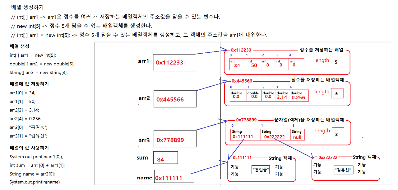 while문 값을 순서대로 하나씩 제공하는 기능 제공할 값이 더이상 남아있는지 여부를 제공하는 기능 (boolean값 제공) 특정객체랑 같이 사용 그래서 while문은 그 특정 객체에 대해서 배울 때 배울거임 while문의 사용 예) List nameList = List.of("김유신", "강감찬", "이순신", "류관순"); Iterator it = nameList.iterator(); while(it.hasNext()) { String name = it.next(); System.out.println(name); } * while문으로 반복작업을 수행할 대상객체는 Iterator이다. * hasNext()는 다음번에 수행할 대상이 남아있는지 확인하는 메소드 배열 1. 1차원 배열 하나의 변수로 여러 ..